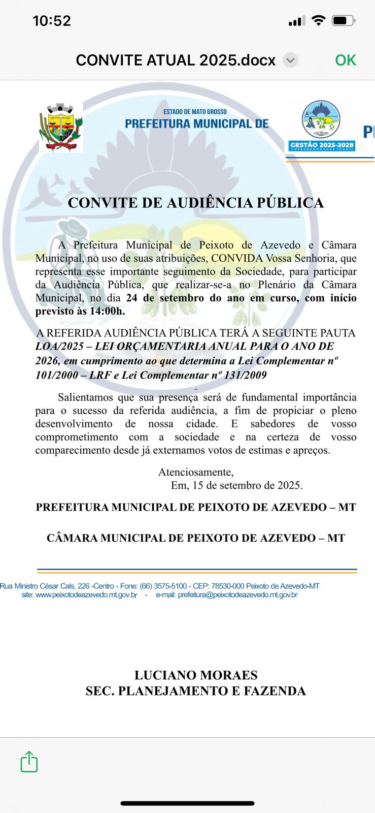 A Prefeitura Municipal de Peixoto de Azevedo e Câmara Municipal, no uso de suas atribuições, CONVIDA Vossa Senhoria, que representa esse importante seguimento da Sociedade, para participar da Audiência Pública, que realizar-se-a no Plenário da Câmara Municipal, no dia 24 de setembro do ano em curso, com início previsto às 15:00h.
